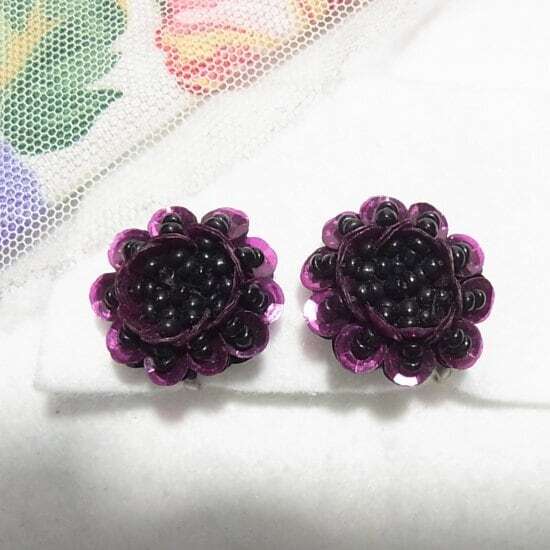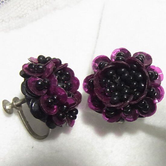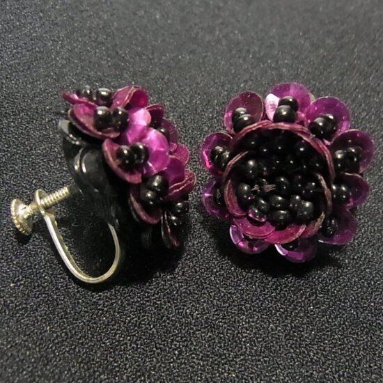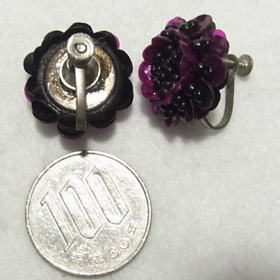 パープルのスパンコール製花型イヤリング アクセサリー卸値以下でセール K1868E